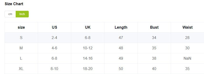 | Size | US | UK | Length | Bust | Waist |